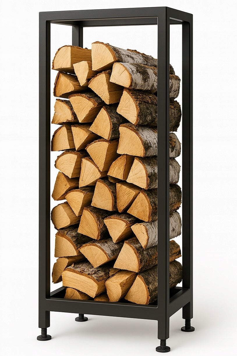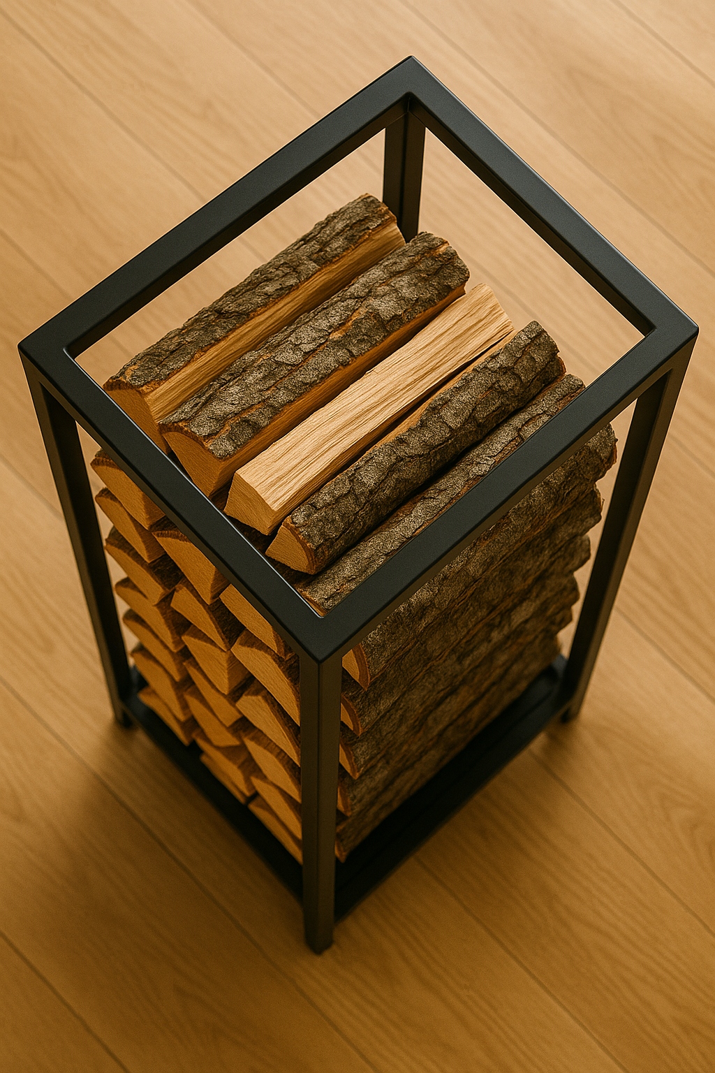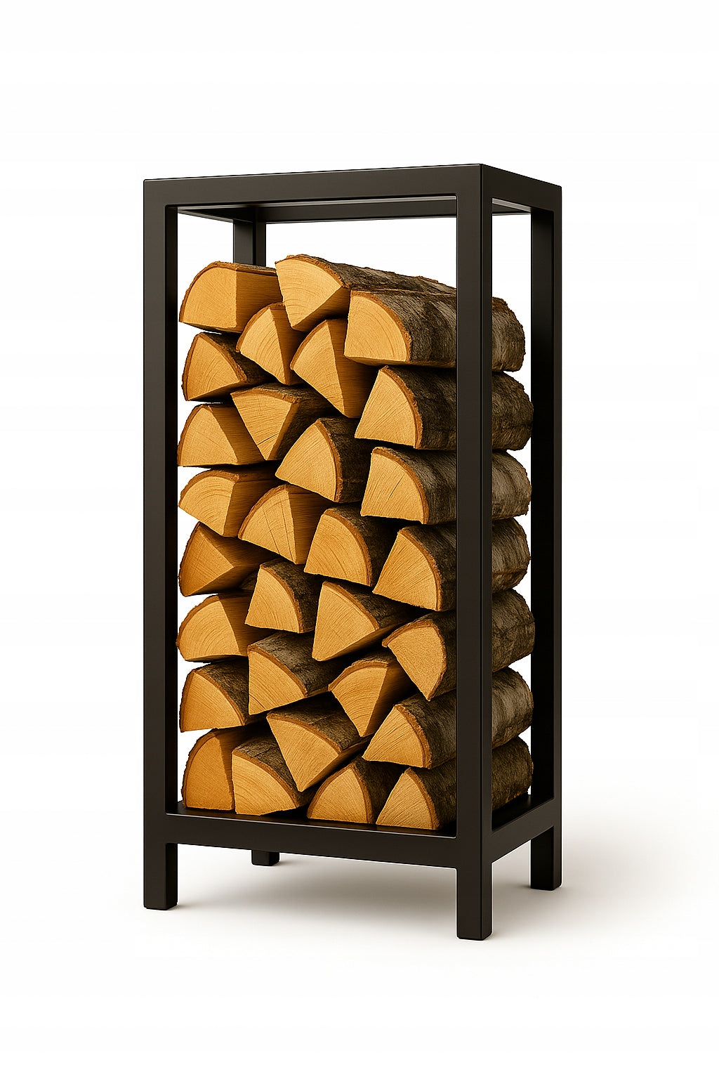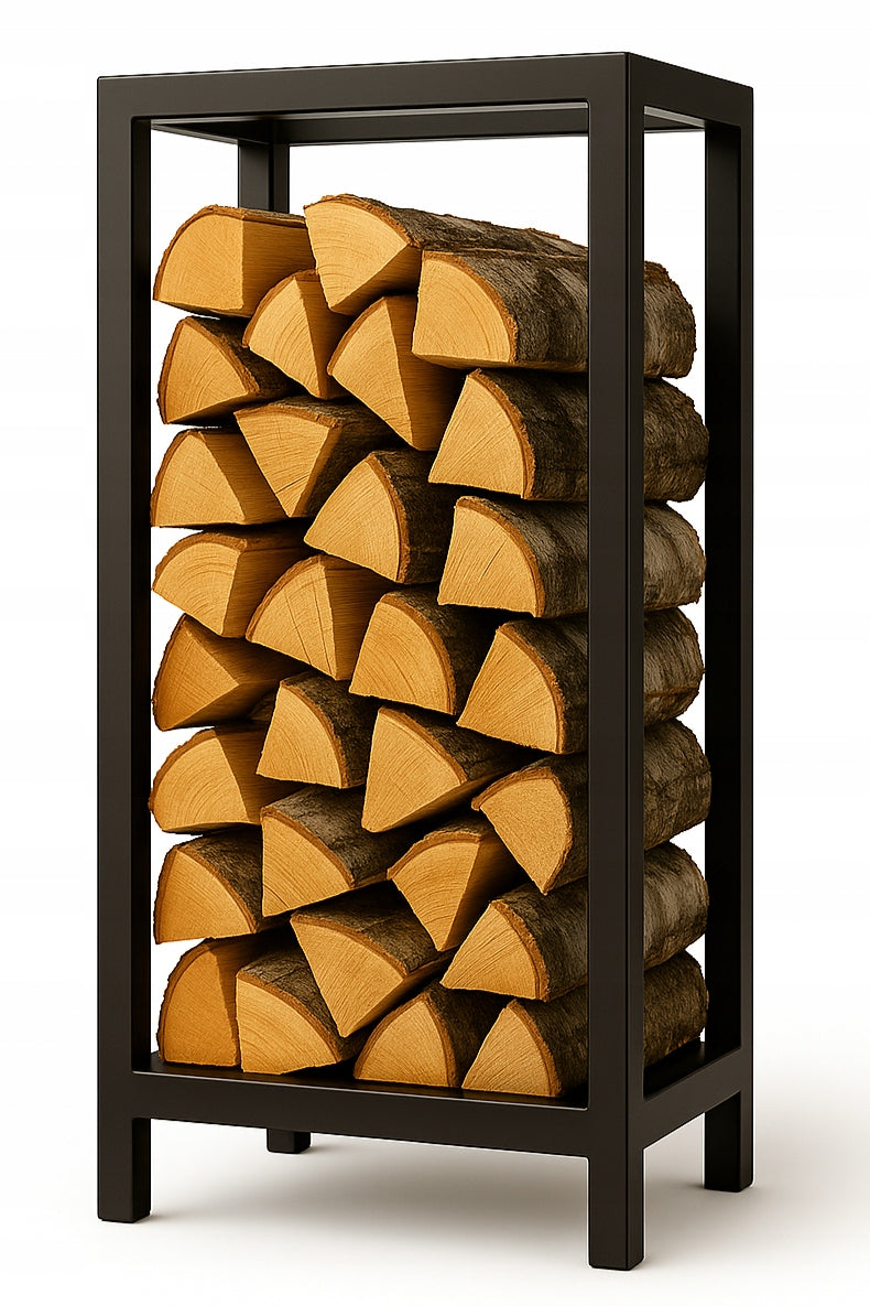 Sztywna rama z profilu stalowego 30x30 mm, malowanie RAL 9005 (czarny mat) oraz spawy szlifowane na gładko gwarantują trwałość i estetykę. Otwarta konstrukcja zapewnia przewiew i wygodne sięganie po polana, a dolna blacha–tacka zatrzymuje korę i pył, chroniąc podłogę.