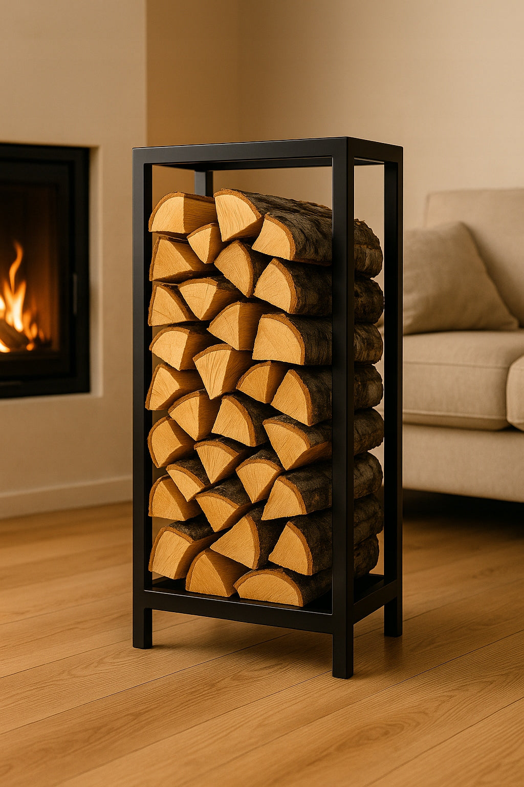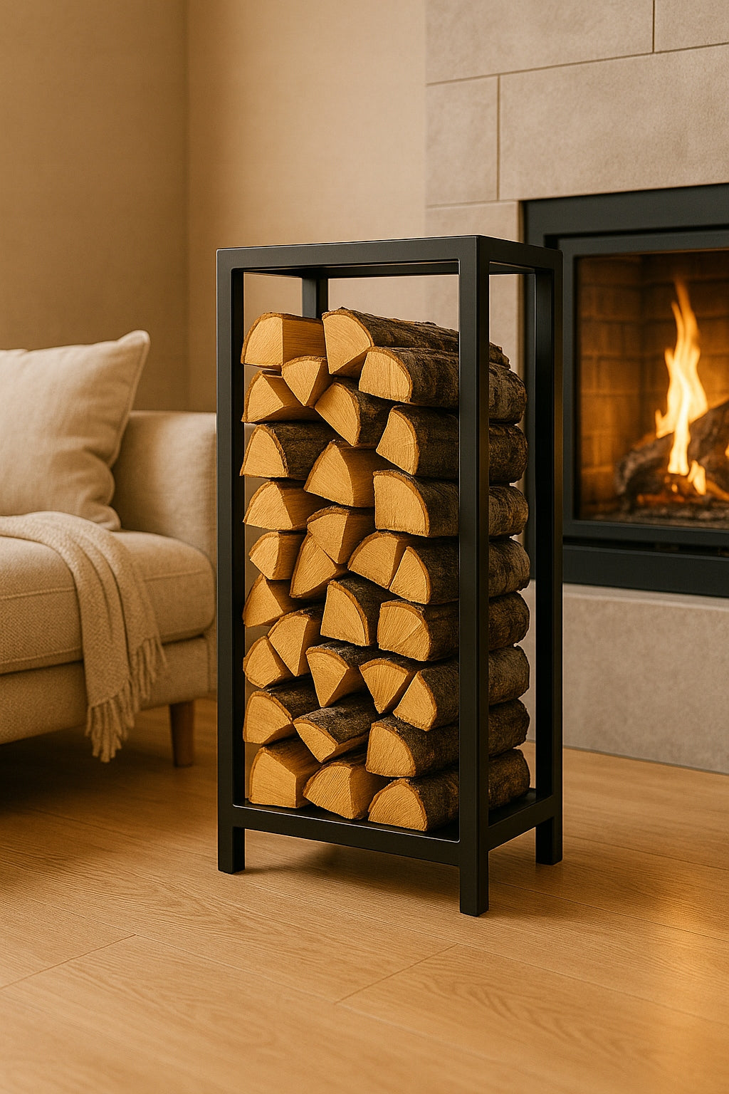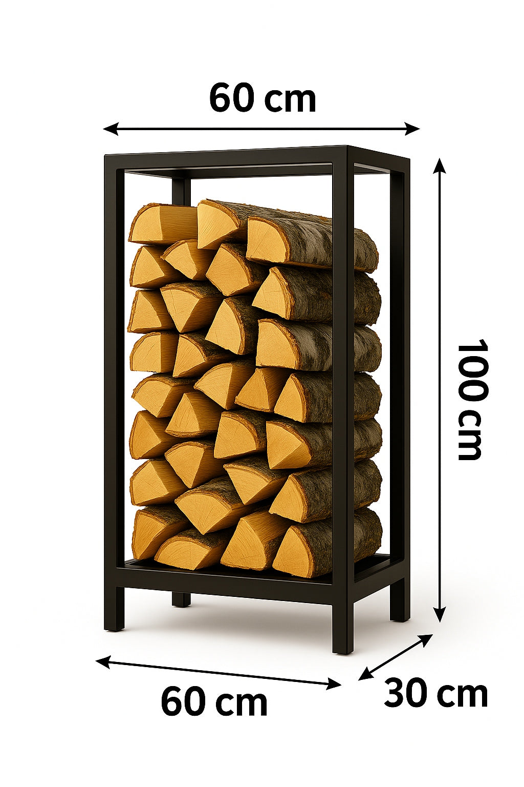 Sztywna rama z profilu stalowego 30x30 mm, malowanie RAL 9005 (czarny mat) oraz spawy szlifowane na gładko gwarantują trwałość i estetykę. Otwarta konstrukcja zapewnia przewiew i wygodne sięganie po polana, a dolna blacha–tacka zatrzymuje korę i pył, chroniąc podłogę.
